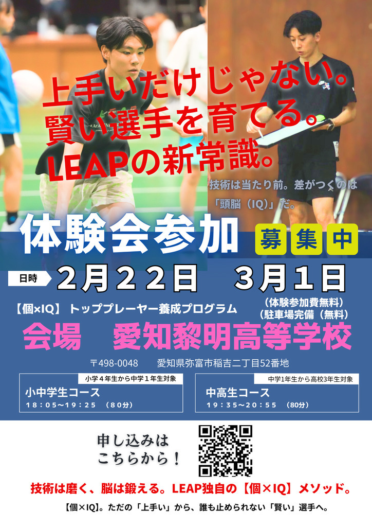 現在のクラブチームや部活動は、どうしてもチーム練習がメインになり、個人スキルを重点的に取り組む時間が確保しずらい状況だと思います。『LEAP』ではチーム戦術の指導などではなく、個人スキルの向上に特化した指導をさせて頂きます。各チームから集まった選手がこのスクールを通して『飛躍』し、各チームで活躍できるようになってくれることが、このスクールの目的です。